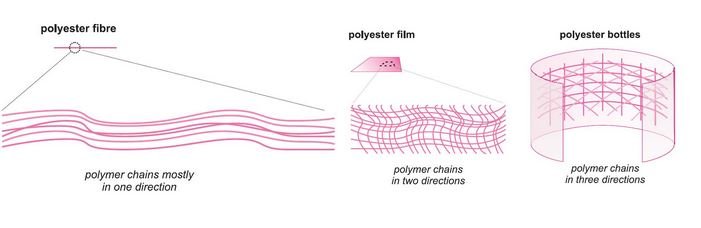 في ألياف PET، يتم ترتيب الجزيئات بشكلٍ رئيسي في اتجاهٍ واحد،أما في الفيلم فهي في اتجاهين، وفي مواد التعبئة ففي ثلاثة اتجاهات.